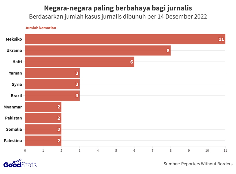 RSF melaporkan bahwa ada sekitar delapan jurnalis yang tewas dalam enam bulan pertama perang berlangsung dilansir TOPmedia dari laman goodstat.id.
